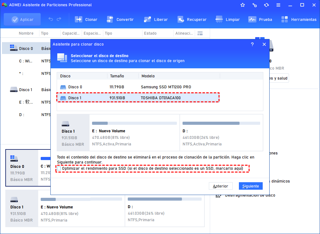 Paso 3. Seleccione el nuevo disco más grande como disco de destino y marque Optimizar el rendimiento para SSD (si el disco de destino seleccionado es un SSD, desactive la opción).