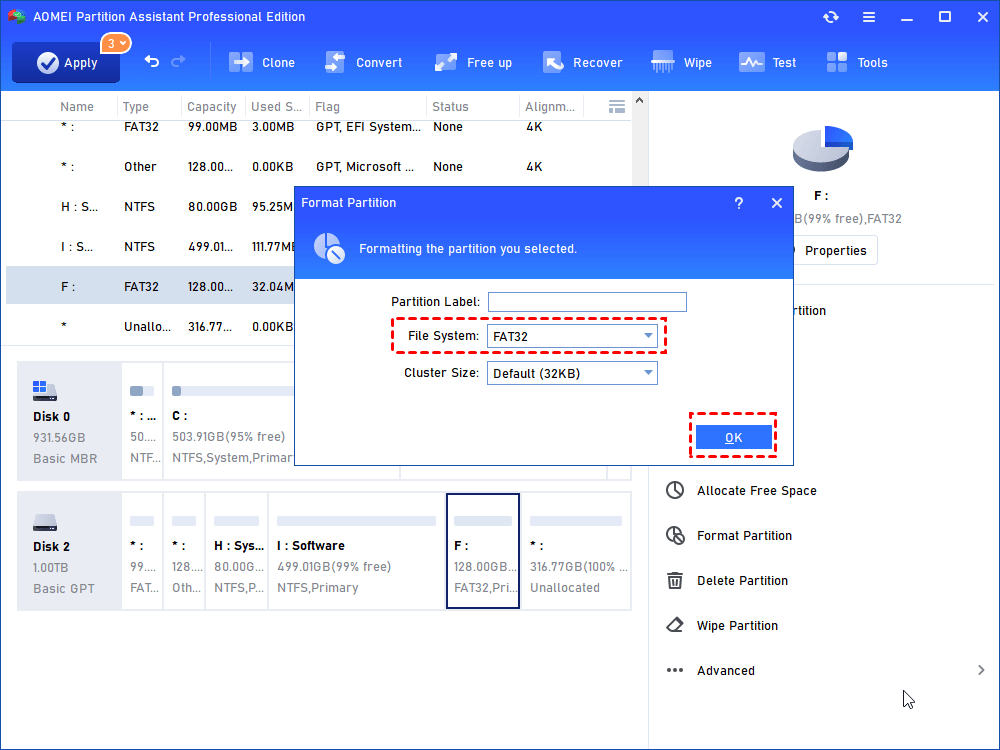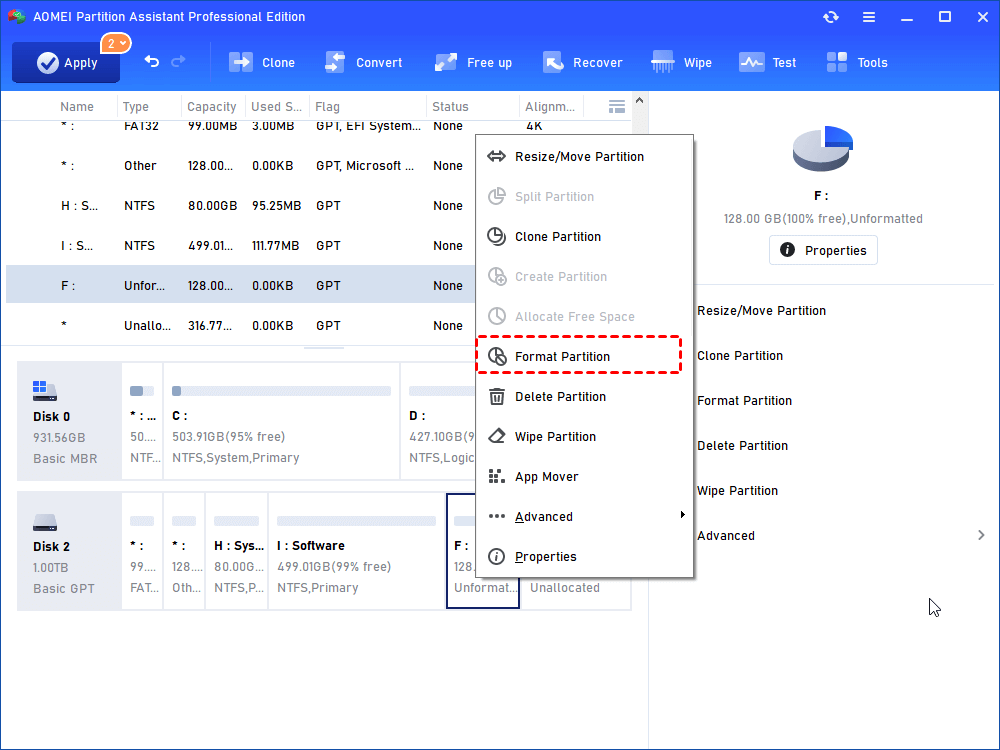 PS4 necesitará un sistema de archivos exFAT, así que primero deberá formatear su disco duro como una unidad exFAT. AOMEI Partition Assistant puede hacer esto por usted. La función "Formatear partición" admite FAT32, exFAT, NTFS, Ext2, Ext3 y Ext4.