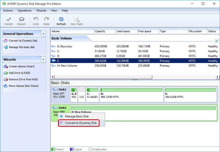 AOMEI Partition Assistant Professional es la forma más fiable y flexible de convertir un disco entre básico y dinámico sin perder datos. Es un completo y potente software de gestión de discos dinámicos o básicos y volúmenes dinámicos para Windows 2000/7/8/8.1/10.