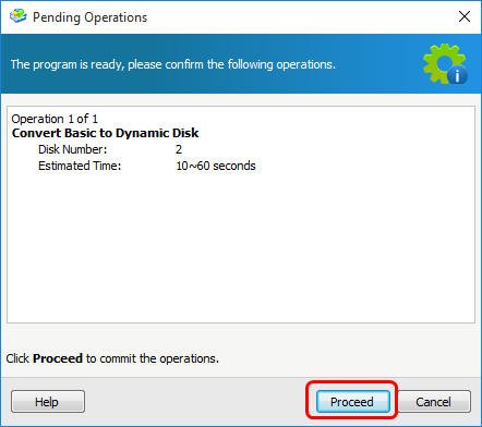3. Pulse Proceder para confirmar la operación pendiente de conversión de disco Básico a Dinámico.