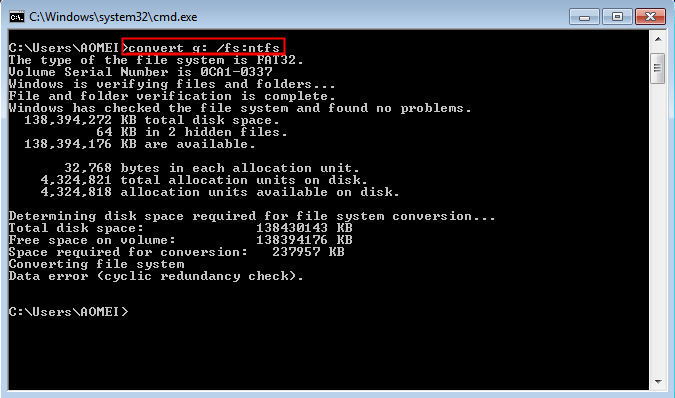 Este método también es fácil de manejar, incluso para los novatos en informática. Sin embargo, puede encontrarse con el mensaje de error "Conversión de FAT32 a NTFS no está disponible". Muchos factores como poco espacio en la partición, sector defectuoso o archivo de página ocupando pueden resultar en este problema. Puede solucionar estos errores uno por uno y continuar con la conversión. O simplemente puede recurrir a un potente software de partición como AOMEI Partition Assistant Professional. El programa "NTFS to FAT32 Converter" de este software le permite convertir FAT32 a NTFS sin formatear ni perder datos y viceversa. Descomprime los archivos comprimidos con NTFS a gran velocidad de forma automática, así como descifra los archivos cifrados de una sola vez. Descarga (compatible con Windows 10/8/7) este conversor y pruébalo.