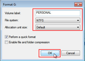 3. En la ventana emergente, especifique la etiqueta del volumen y seleccione el sistema de archivos NTFS. El "Tamaño de la unidad de asignación" puede modificarse. A continuación, haga clic en "Aceptar". Por defecto, se realizará un formateo rápido.