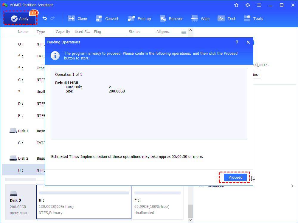 3. Haga clic en "Aplicar" y luego en "Proceder" para confirmar la operación pendiente.