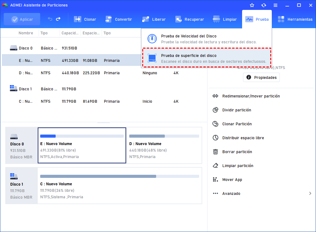 Si no le importa emplear una herramienta de terceros para completar la reparación del disco duro Toshiba, vea cómo reparar un disco duro Toshiba dañado utilizando AOMEI Partition Assistant Standard. Puede comprobar los sectores defectuosos, la superficie del disco de prueba, reconstruir MBR y limpiar el disco duro Toshiba y otros discos duros de marca.