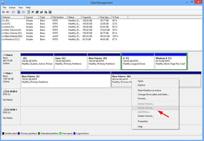 1. Verifique el sistema de archivos de la partición, porque la Administración de discos solo admite NTFS. Si el disco no es NTFS, puede convertirlo a NTFS, luego, usa la opción de Reducir Volumen de la Administración de discos para hacerlo.