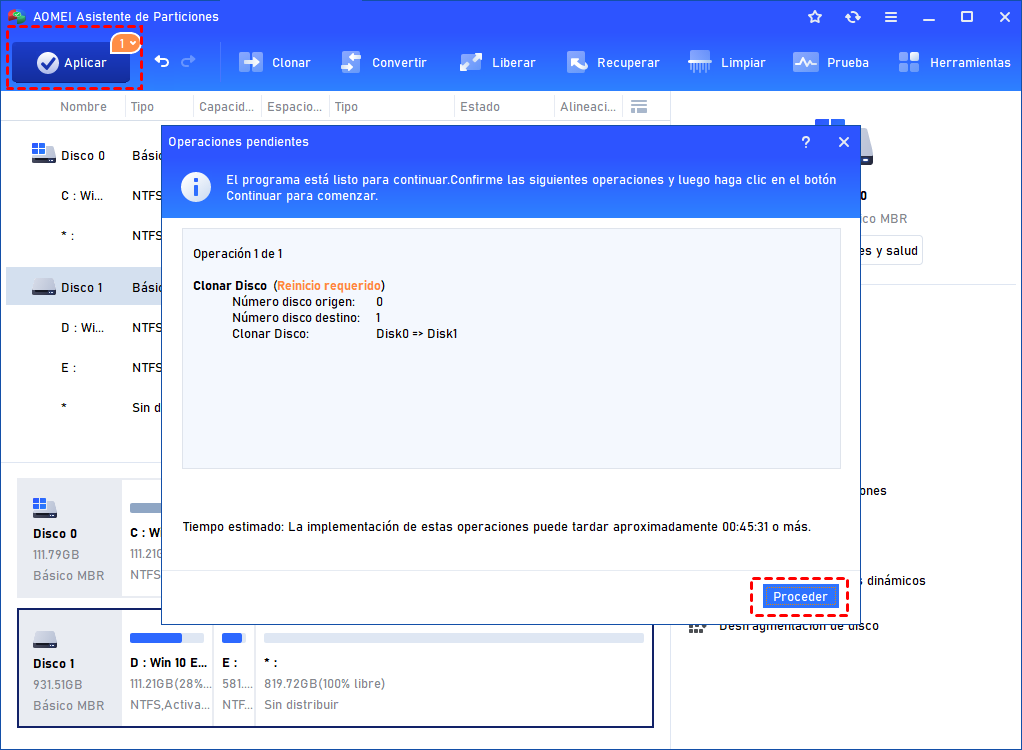 Paso 5. Luego proporcionará instrucciones sobre cómo arrancar desde el SSD de destino. Después de eso, obtenga una vista previa del resultado virtual. Haga clic en "Aplicar" > "Proceder" para ejecutar las operaciones pendientes.