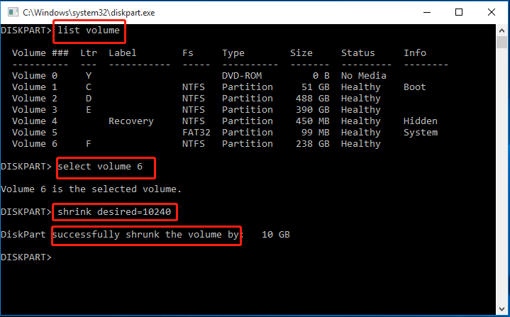 Paso 3. Puede obtener este mensaje: "Diskpart redujo correctamente el volumen" después de reducirlo.