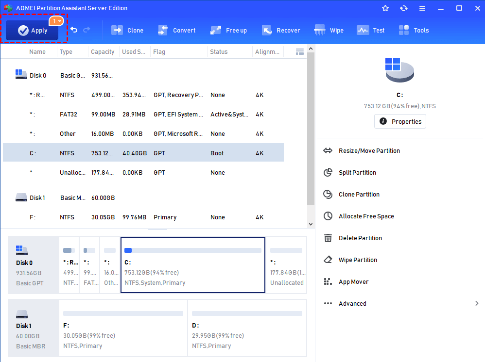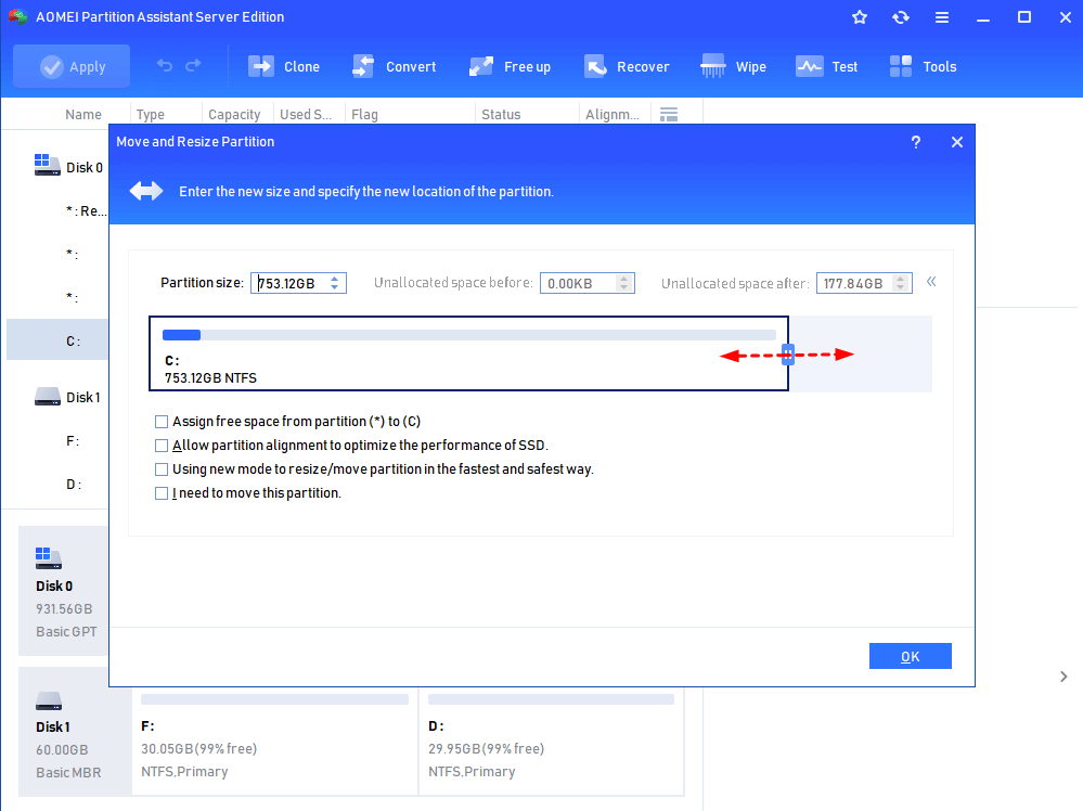 Para compensar las limitaciones de Diskpart mencionadas anteriormente, necesitamos utilizar una herramienta de gestión de particiones de terceros. Para esta tarea especial, AOMEI Partition Assistant Server es una buena elección.