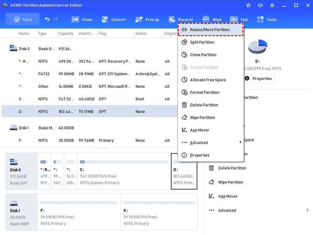 Paso 1. Instale e inicie AOMEI Partition Assistant Server. Haga clic derecho en la partición que tiene algo de espacio libre para añadir a la partición C y seleccione Redimensionar/mover partición.