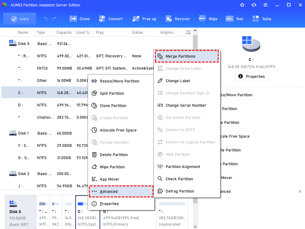 Paso 1. En la interfaz principal, haz clic derecho en la unidad C, elige “Avanzado” y selecciona "Fusionar Particiones".