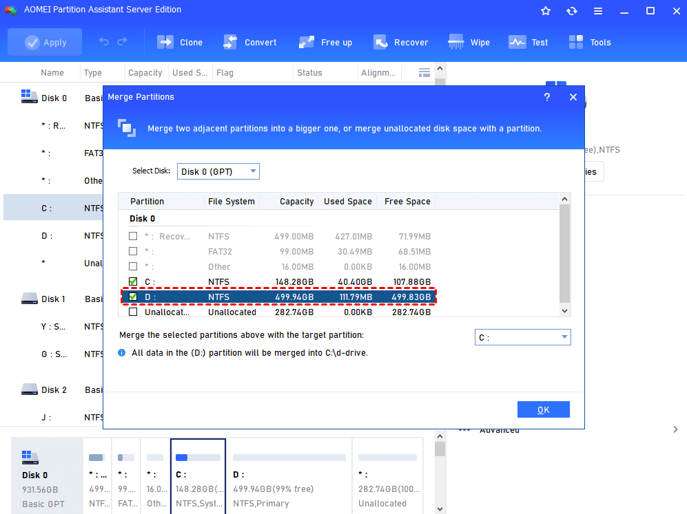 Por lo tanto, es posible fusionar la unidad C y la unidad D en Windows Server 2025/2022/2019/2016/2012/2025. Hay dos métodos disponibles para tu selección. Además de fusionar dos particiones adyacentes o fusionar espacio no asignado en una partición existente, el Asistente de Particiones AOMEI para Servidor también puede realizar otras operaciones desafiantes de partición de disco, como recuperar particiones eliminadas, clonar partición, mover partición, clonar disco duro, convertir MBR y GPT sin eliminar particiones, entre otras.