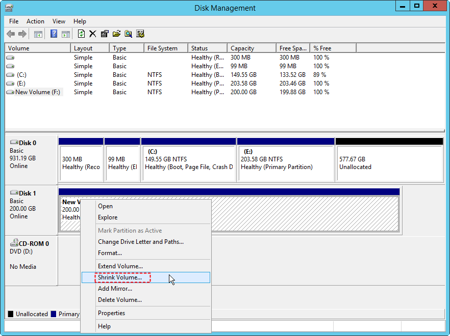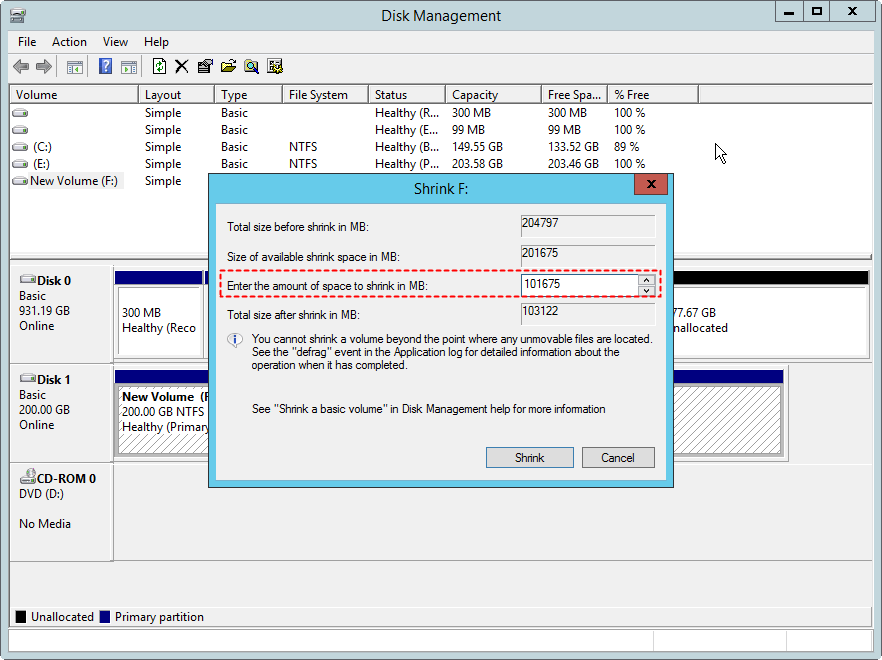 Más fácil de reducir volumen Server 2012 con un gestor de particiones