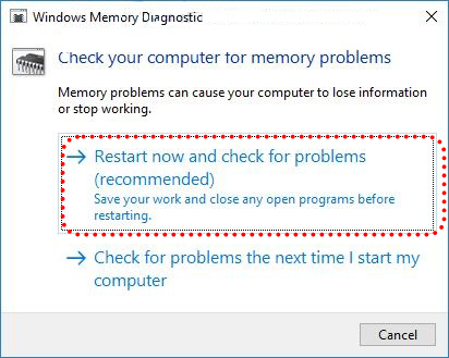 Step 3. In the window that appears, choose Restart now and check for problems (recommended).