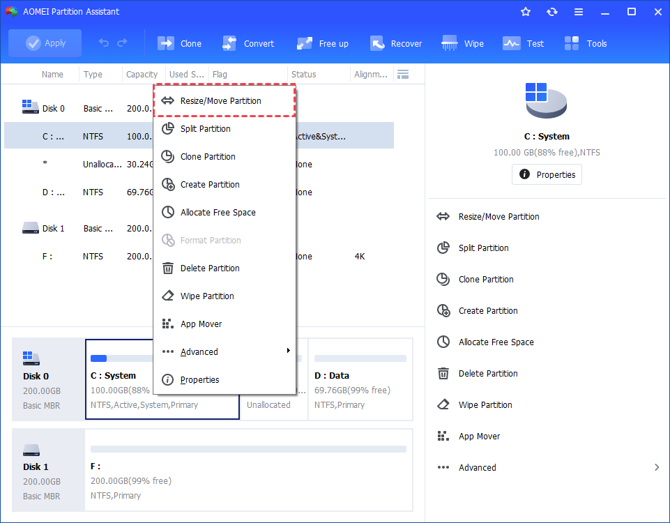 Launch AOMEI Partition Assistant. In the main console, you can view the whole partition configuration. In this demonstrator, there is an unallocated space behind C drive. Then, right-click the partition (here is C: partition) you want to extend and select "Resize /Move Partition".