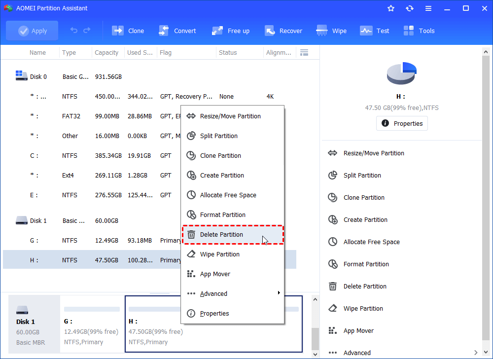 In such a condition, it is highly recommended to employ a GUI partition manager for USB flash drive or SD card – AOMEI Partition Assistant Standard. It is easy to handle and can work with Windows 11/10/8.1/8/7, XP, or Vista. Apart from deleting partition on USB flash drive, it allows you to extend FAT32 partition on it. Free download it and have a look at how it works:
