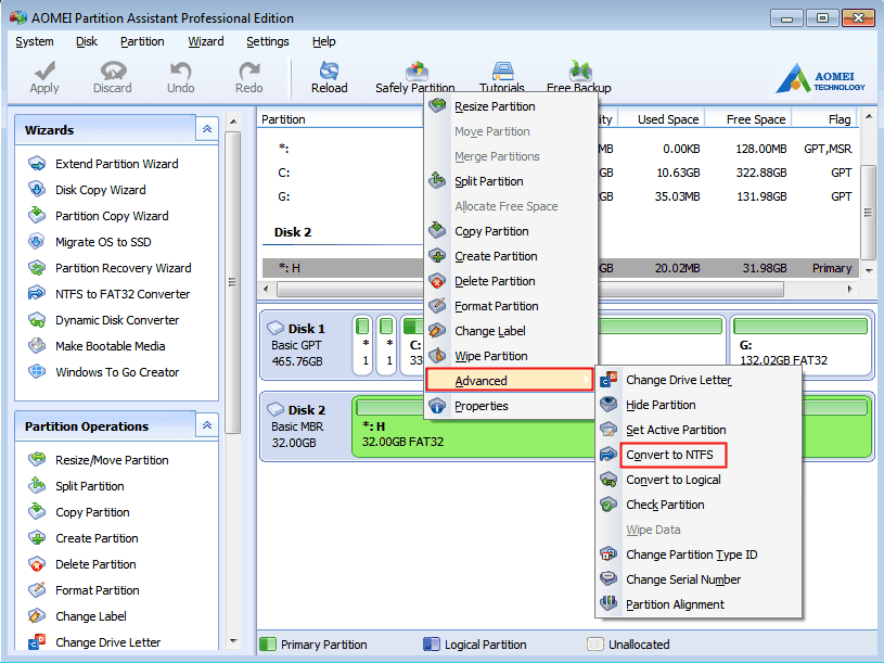 Fix “convert FAT32 to NTFS not available” via AOMEI Partition Assistant