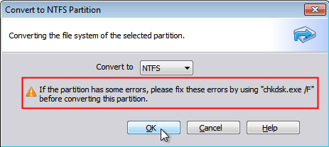 2. Pay attention to the warning: If the partition has some errors, please fix these errors by using “chkdsk.exe /F” before converting this partition. If there is no error, click “OK”.