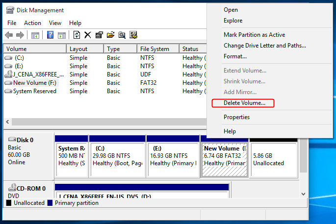 1. With Disk Management open, click on one existing primary partition and select Delete Volume. This will delete data on the selected partition, backup the important data beforehand.