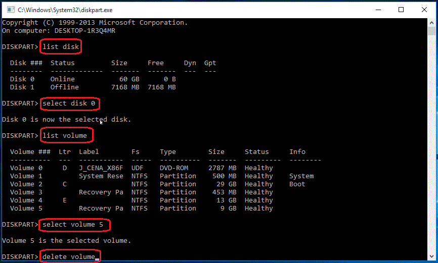 As you know, you are not allowed to delete recovery partition in Windows Disk Management, but you use Diskpart.exe to delete partitions from command prompt. You can use the following steps to remove recovery partition with diskpart: