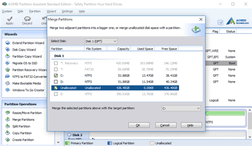 The built-in Disk Management of Dell windows has many limits when you extend C drive: firstly, you should make sure there is an unallocated space; secondly, you should ensure that the unallocated space is adjacent and behind C drive. In this way, you can use DM to merge the unallocated space into C drive so as to extend C drive. Luckily, AOMEI Partition Assistant can help you easily extend C drive no matter where the unallocated space is. Next, we will show you how to extend C drive with AOMEI Partition Assistant. Free download it at first!