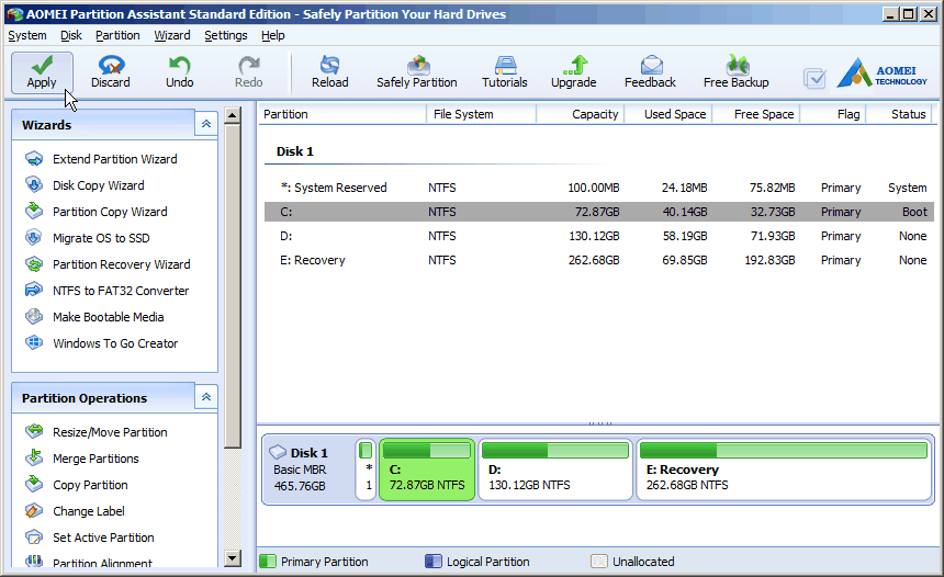 When Dell ExtPart failed to connect, you can turn to a free third-party disk management tool - AOMEI Partition Assistant Standard(Compatible with Windows 11, 10, 8, 7, XP, and Vista). It not only provides different useful features, including extend, shrink, create, merge, format partition, but also come with users-friendly interface making all operation easy.