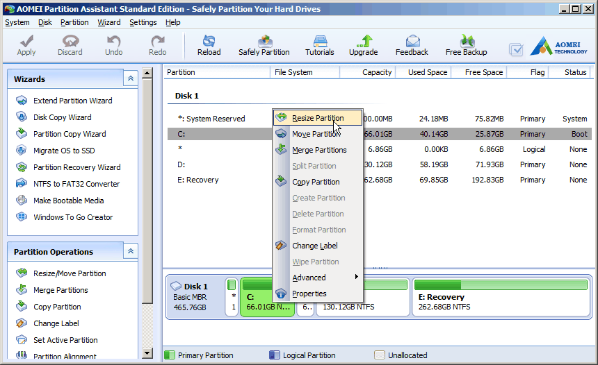 Step 1. Open AOMEI Partition Assistant, you will your disk information and various features demonstrated on the main interface. To change a partition size, right-click on it, and choose “Resize/Move Partition”.