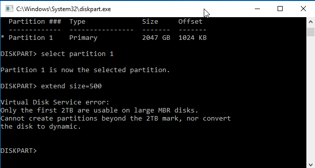 Why DiskPart cannot extend partitions beyond the 2TB?