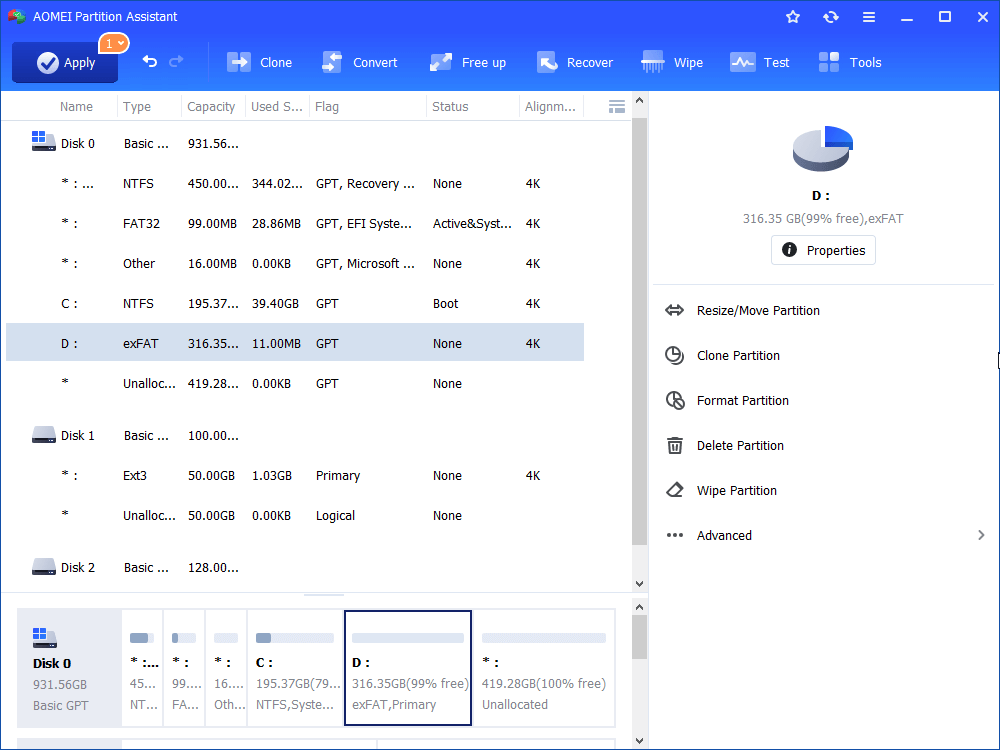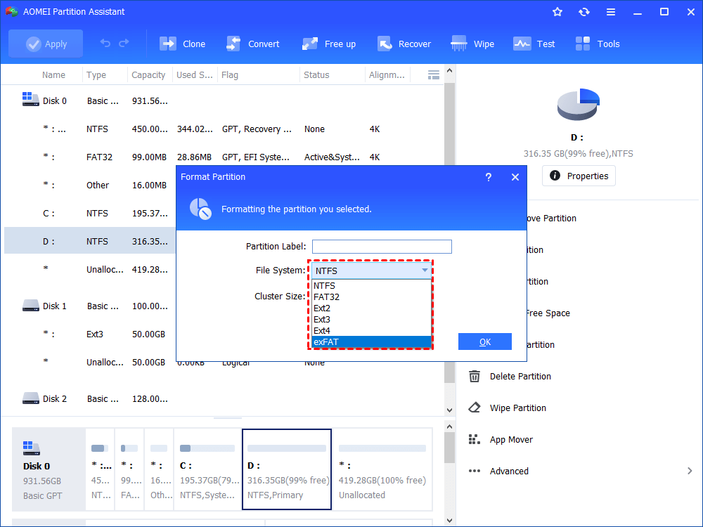 Yes, there is a freeware called AOMEI Partition Assistant Standard that can format a disk, SD card, USB drive to exFAT, NTFS, FAT32, and Ext2/3/4 file systems to meet different demands. And by its intuitive interface, you can finish the operation in a few clicks. Just click the following button to download AOMEI Partition Assistant and follow the tutorial.
