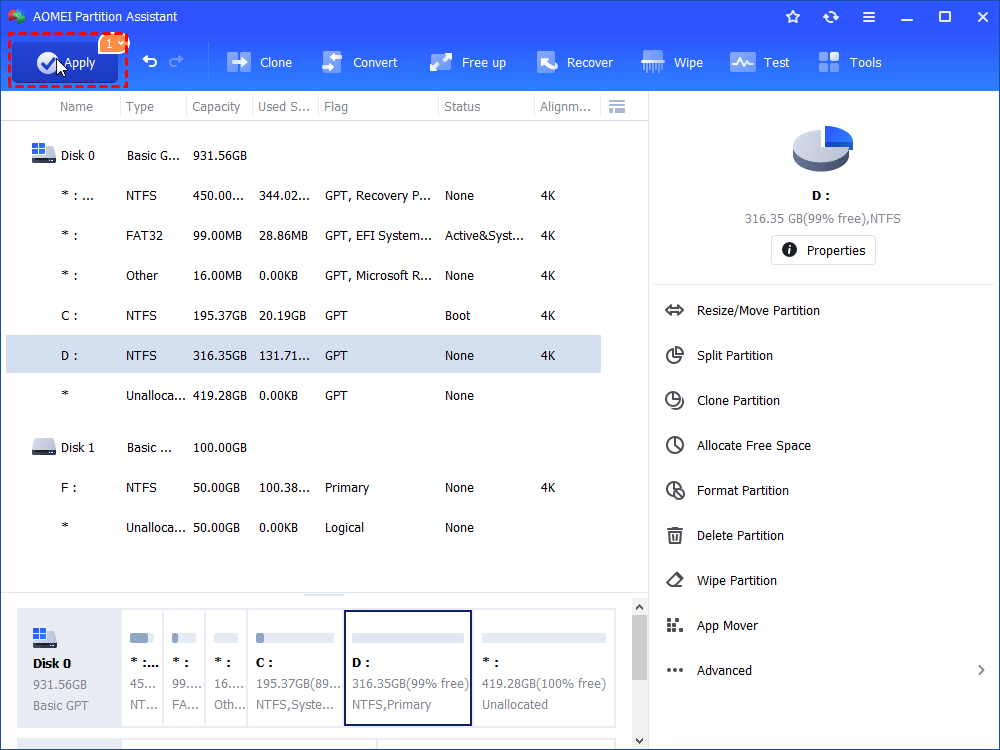 If a partition is hidden and you cannot find it and access it, it is a good choice to turn to a free partition manager for help. The AOMEI Partition Assistant should be a great choice. If your computer is base on Windows Server 2012, 2016, 2019, 2022, 2025, the AOMEI Partition Assistant Server can help you settle all partition problems.