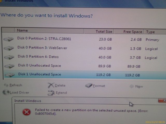 Failed to create a new partition on the selected unused space. [Error: 0x8007045d]. Under some circumstances, you may also get the error 0x8004240f.