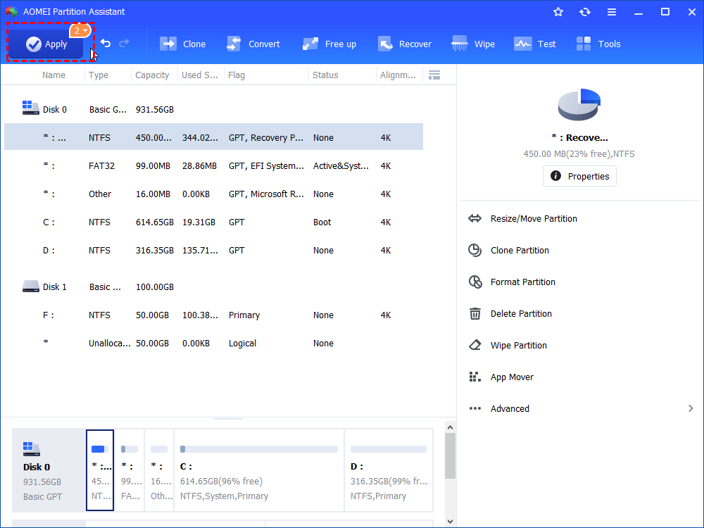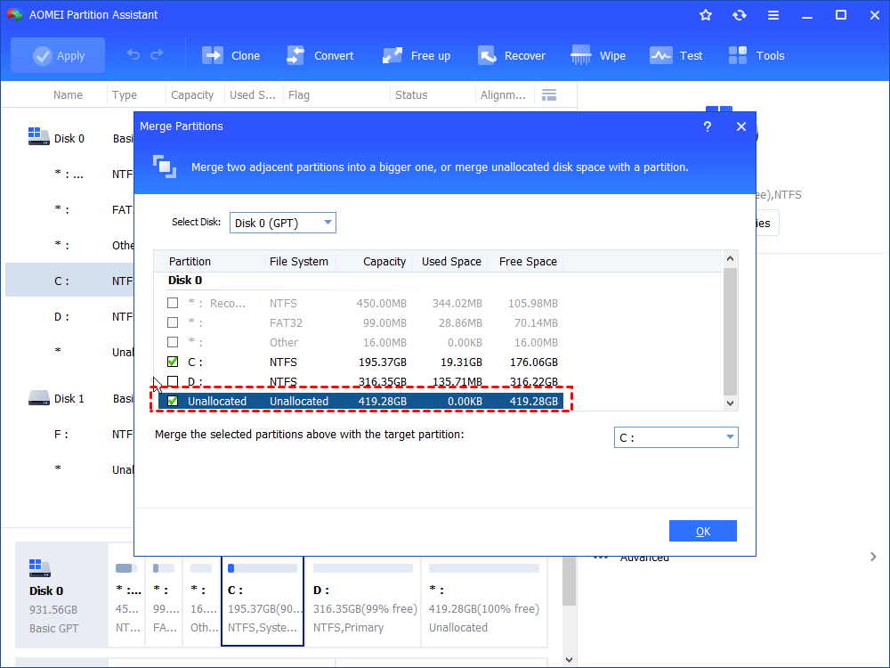 As for extending a partition, the software does not require the contiguous unallocated space. This above feature can directly merge adjacent and non-adjacent unallocated space into the to-be-extended partition. Optionally, you can allocate free space to C drive directly using the professional edition of AOMEI Partition Assistant.