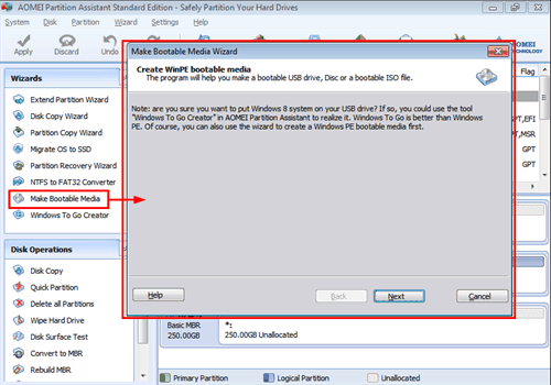 1. Install and launch AOMEI Partition Assistant. Click Make Bootable Media under Tools, and confirm to click Next.