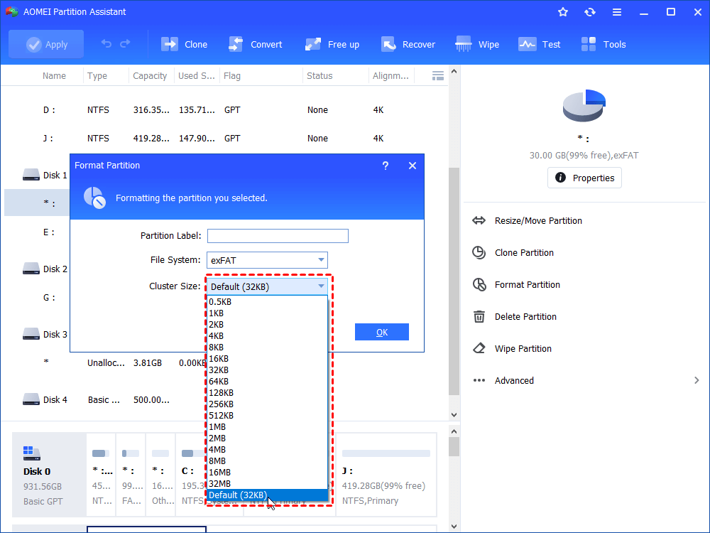 To get the USB drive formatted with exFAT properly and smoothly, it is a wise move to turn to a third-party format tool. AOMEI Partition Assistant Standard is a free USB exFAT format tool that will assist you to format a USB flash drive, USB hard drive, thumb drive, pen drive, and SD card from FAT32 or NTFS to exFAT. The cluster size option varies from 0.5KB to 32MB, which is quite adequate for normal use. Windows 11, Windows 10, Windows 8, Windows 8.1, Windows 7, Windows Vista, and Windows XP are supported.