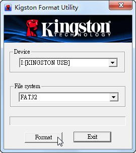 Step 3: As soon as Kingston Format Utility was started up, your Kingston USB drive will be automatically listed under the "Device". Under the "File system", there is no other file system available to choose except the FAT32. In other words, this tool only supports to format USB to FAT32. Click "Format" to continue.