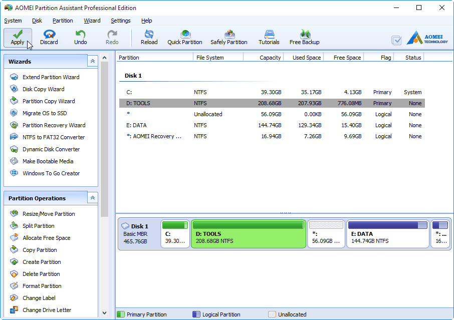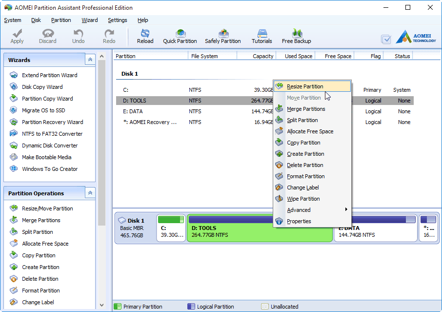 AOMEI Partition Assistant Standard is a free partition tool that can resize partitions without losing data. You use it to manage your partitions and disks from its intuitive graphic users interface (GUI) or command prompt in Windows 10, 8, 7.