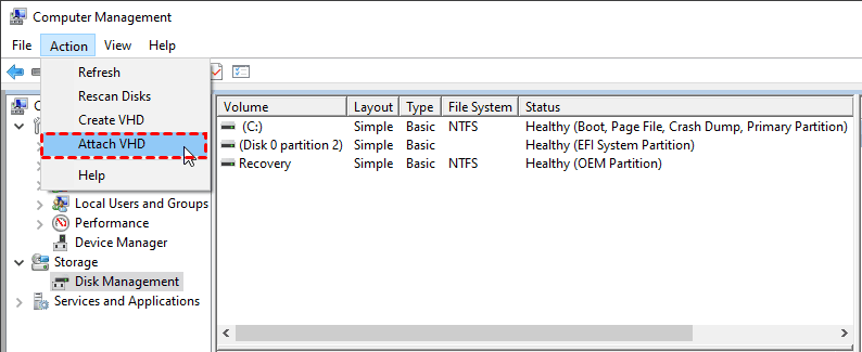 Step 2. In the Disk Management window, click on Action in the menu bar and choose Attach VHD.