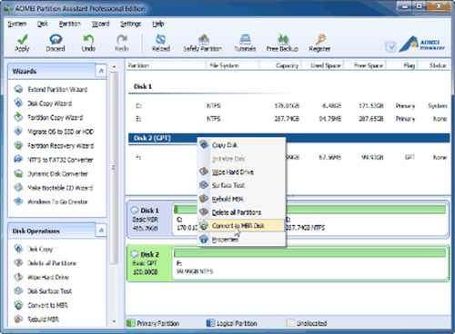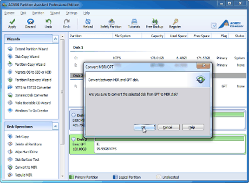 How to remove the GPT partition style safely? Diskpart offers to delete GPT and replace it with MBR via commands. It’s free but complex and makes you suffer from data loss. AOMEI Partition Assistant Professional makes it much easier by combining the steps into one and won’t clean the data on the safer GPT disk. So, considering convenience and safety, I prefer the latter one.
