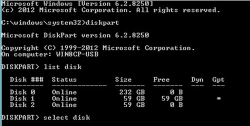 5. Type “select disk *”(”*” represent the number of the GPT disk)and hit “ENTER”.
