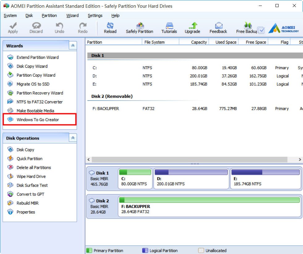 Here you can use third-party software to transfer Windows to USB drive without the limitations of Windows To Go. AOMEI Partition Assistant Standard is a great powerful partition manager that has a great tool Windows to Go Creator, which enables you to create Windows to Go USB drive for Windows 8/8.1 and Windows 10, no matter it is Enterprise edition or not, no matter the USB drive is Microsoft-certificated or not. Now, see how to make portable version of Windows on USB drive via the software.
