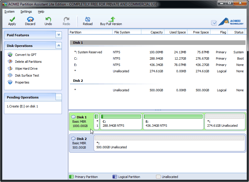Although you can enlarge partition in Server 2008 (R2) with the Disk Management, it requires you to delete an adjacent partition, and that will erase all data on the deleted partition. To do that more easily and flexibly, it is recommended to use the free Server partition manager: AOMEI Partition Assistant Lite. It is able to move unallocated space to make it adjacent to the partition you will extend. Download it and have a try. (Following demostration is based on there are C, E and unallocated space, and shows how to extend C with unallocated space. )