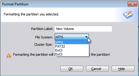 3. In the pop-up window, select File System. Here you can also choose cluster size for the partition.