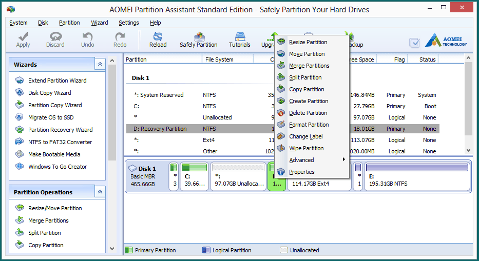 This time, AOMEI Partition Assistant Professional might be your best choice. You’re enabled to extend recovery partition D with its inbuilt Extend Partition Wizard. Then, even if the partition and the unallocated space aren't adjacent or the partition is FAT32, the extending process can be performed as normal. Meanwhile, you can still enlarge the partition by using the features of “Merge Partitions” and “Allocate Free space”.