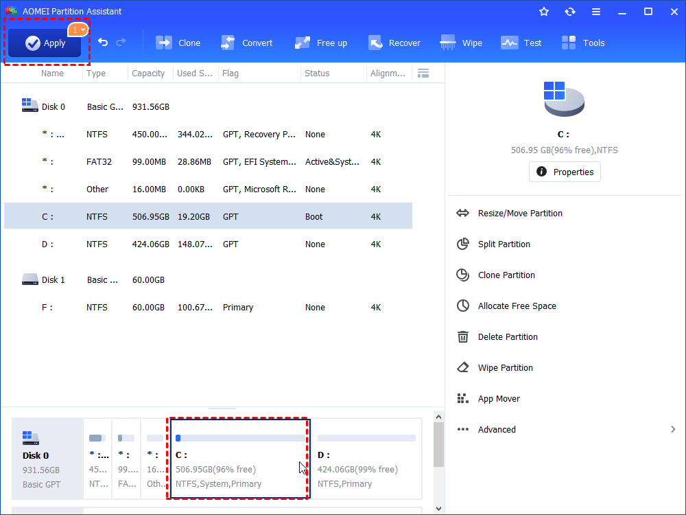 Copy partition is another important feature provided by AOMEI Partition Assistant. It can migrate one selected partition from one disk to another HDD/SSD. If you want to transfer or back up your important data, effectively, copying partition is very helpful for you.