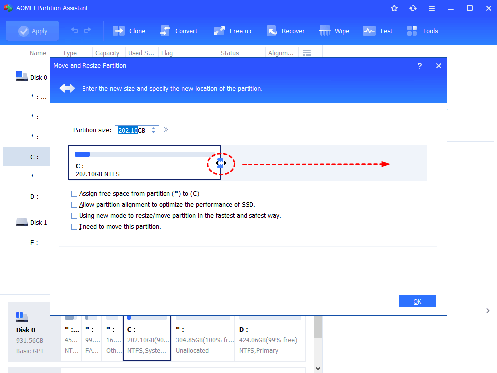 Step 2. In the small window, you can extend the partition size by dragging the border rightwards. And click “OK”.