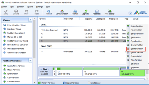 Step 1. Install and run the tool. Right-click F drive and select “Delete Partition”.