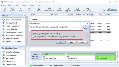 Delete partition quickly: the data which has been deleted is recoverable if you choose this option.