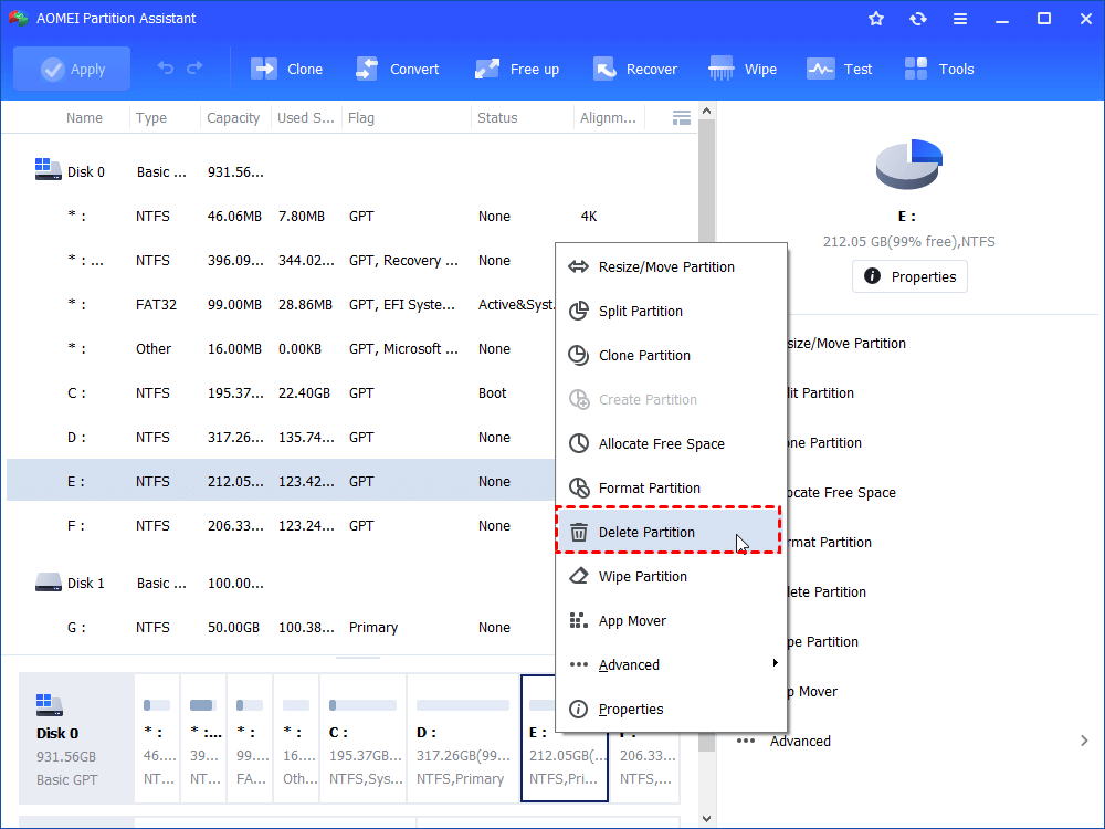 Delete partition and wipe all data to prevent data recovery: AOMEI Partition Assistant will delete the partition and wipe all data on it. The data which has been deleted will not be recovered by any data recovery software, so use with caution.