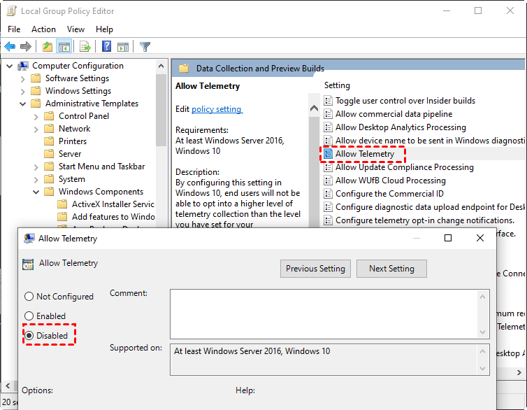 Step 3. Double-click "Allow Telemetry", tick the "Disabled" option, and then click "OK".