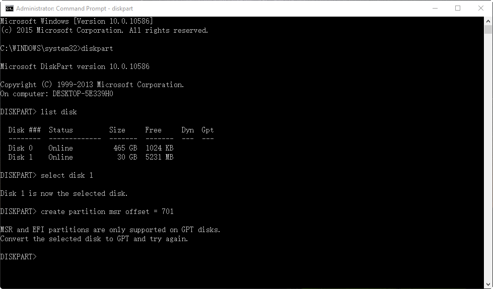 “Hi every one! I need help on Diskpart. I am using Windows 8, when I boot with the Win 8 installation DVD to refresh or restore. It cannot be finished and says disk is locked and only command prompt working. I was advised to use diskpart and i did that. I successfully selected the disk 0 and listed all partitions. But when i was trying to create partition, the message pops out saying this: MSR and EFI partitions are only supported on GPT disks. Convert the selected disk to GPT and try again.”