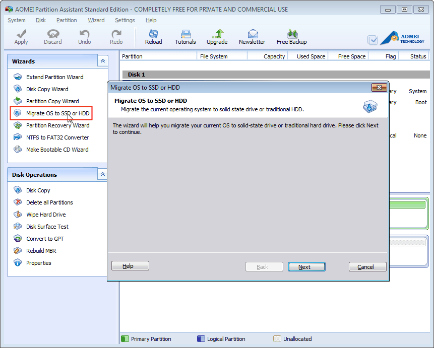 It provides an extremely useful feature - Migrate OS to SSD, which is designed especially for completely transferring your OS and related data to the new SSD. Besides, it also includes the "Disk Clone Wizard", a feature which can help you transfer all data from HDD to SSD, including OS and personal data.